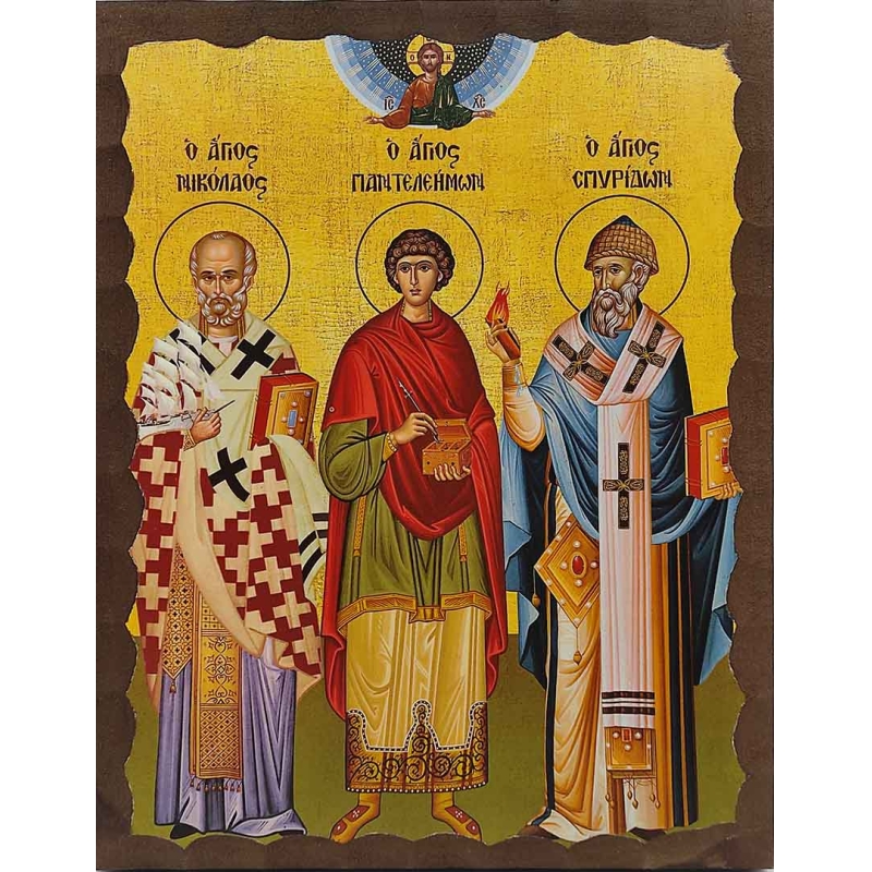 Εικόνα Ξύλινη Άγιος Νικόλαος, Άγιος Παντελεήμων, Άγιος Σπυρίδων 21 χ 27